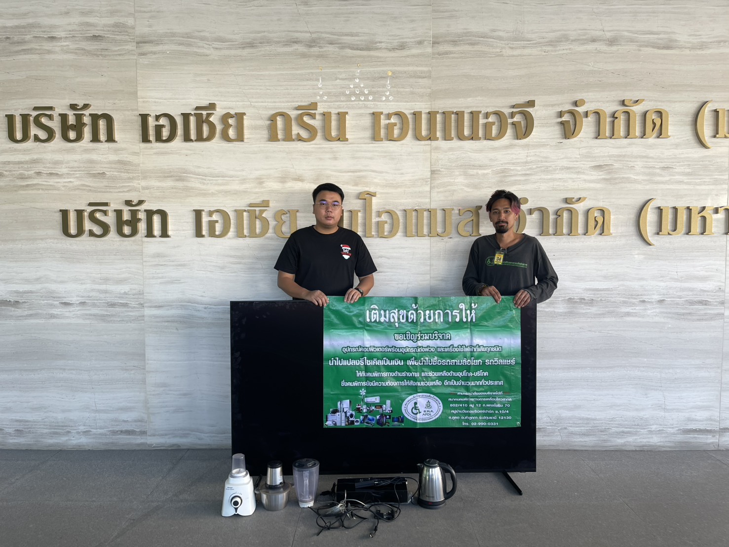 บริษัท เอเชีย กรีน เอนเนอจี จำกัด (มหาชน) หรือ AGE โดย คุณอธิภัทร ควรสถาพร ผู้ช่วยผู้จัดการฝ่ายคลังสินค้าและโลจิสติกส์ มอบ จอ LED และเครื่องใช้ไฟฟ้าที่ชำรุด ให้แก่ สมาคมคนพิการทางการเคลื่อนไหวสากล เพื่อให้นำไปเข้าสู่กระบวนการรีไซเคิลและจำหน่าย โดยรายได้จากการดำเนินการดังกล่าวจะนำไปจัดซื้อ รถเข็นวีลแชร์สำหรับช่วยเหลือผู้พิการ ให้สามารถดำรงชีวิตประจำวันได้อย่างสะดวกและมีคุณภาพชีวิตที่ดีขึ้น บริษัท เอเชีย กรีน เอนเนอจี จำกัด (มหาชน) ยังคงยึดมั่นในการดำเนินธุรกิจควบคู่กับความรับผิดชอบต่อสังคมและสิ่งแวดล้อม เพื่อร่วมสร้างการเติบโตอย่างยั่งยืนให้กับสังคมไทยต่อไป โดยมีเจ้าหน้าที่สมาคมคนพิการทางการเคลื่อนไหวสากลเป็นตัวแทนรับมอบ ณ บริษัท เอเชีย กรีน เอนเนอจี จำกัด (มหาชน) สำนักงานใหญ่ ถนนพระราม 2 กรุงเทพฯ เมื่อเร็วๆนี้